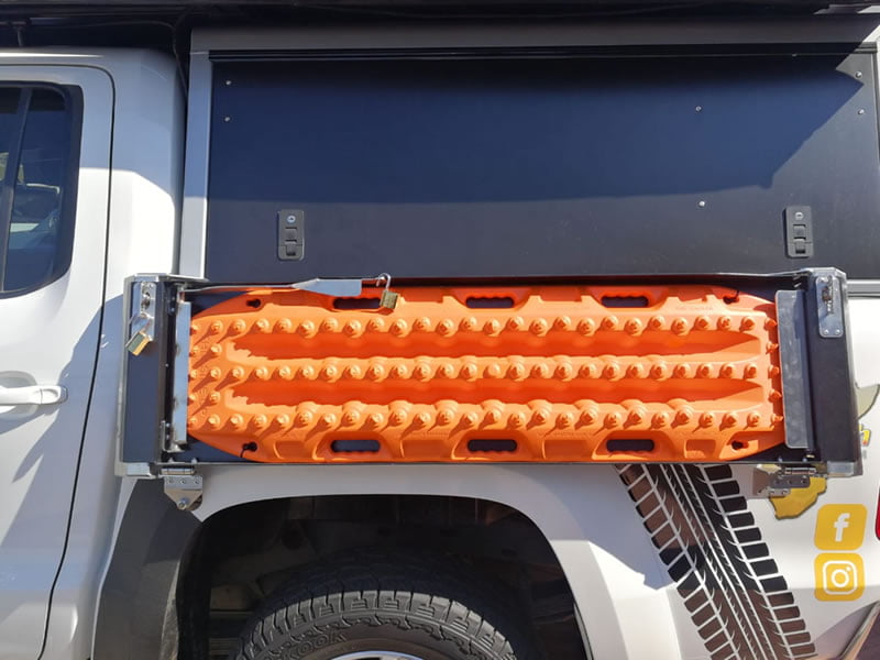 The Trax-Tab was developed knowing that there is a need in the industry for an easy and safe way to clamp down on your traction aids without the use of bolts, lockers or ratchet straps. This system allows you to remove and store you traction aids in 3 seconds without undoing bolts or straps.